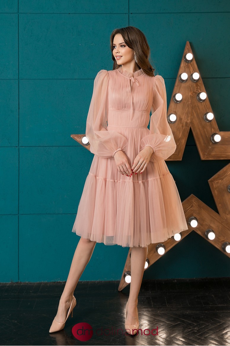 The velvety powdery color of the dress, decorated with delicate flowers, with transparent ..