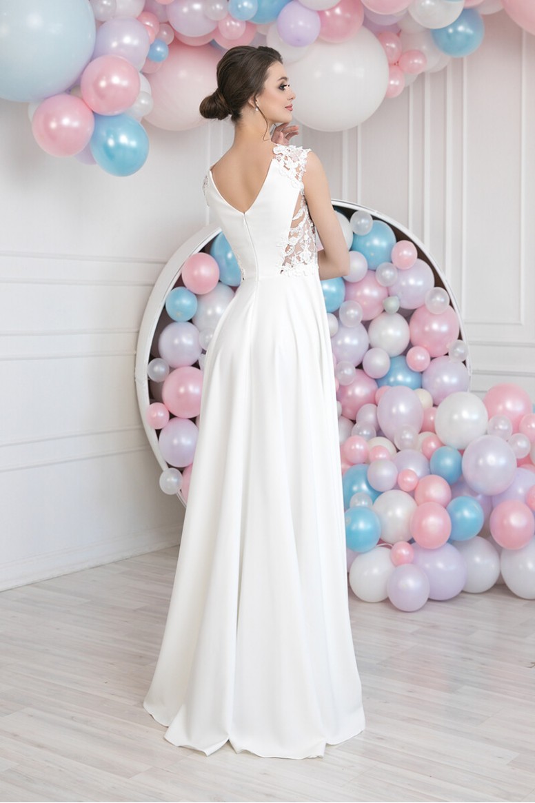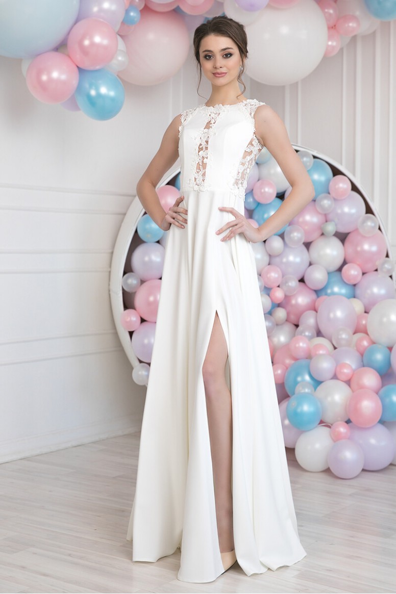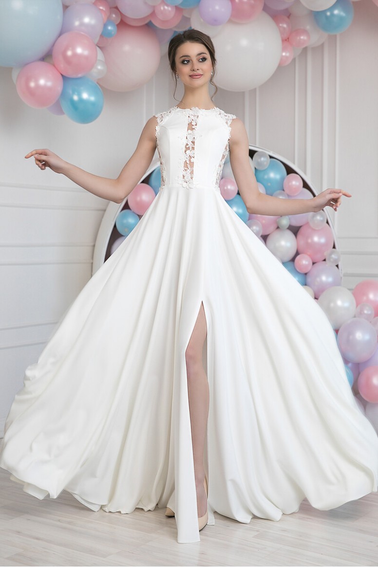 In this delicate, romantic dress, the young beauty will be surrounded by universal admiration! The details of the bodice are only slightly fastened with exquisite flowers of expensive lace, and leave the body parts on the sides and on the chest slightly open, and the high cut of the skirt will show off the chiseled legs! This style can afford a bold girl with a flawless figure and beautiful skin. And without a doubt, she will be irresistible in this dress! Dress without a corset, does not restrict movement, the bride will feel very comfortable.