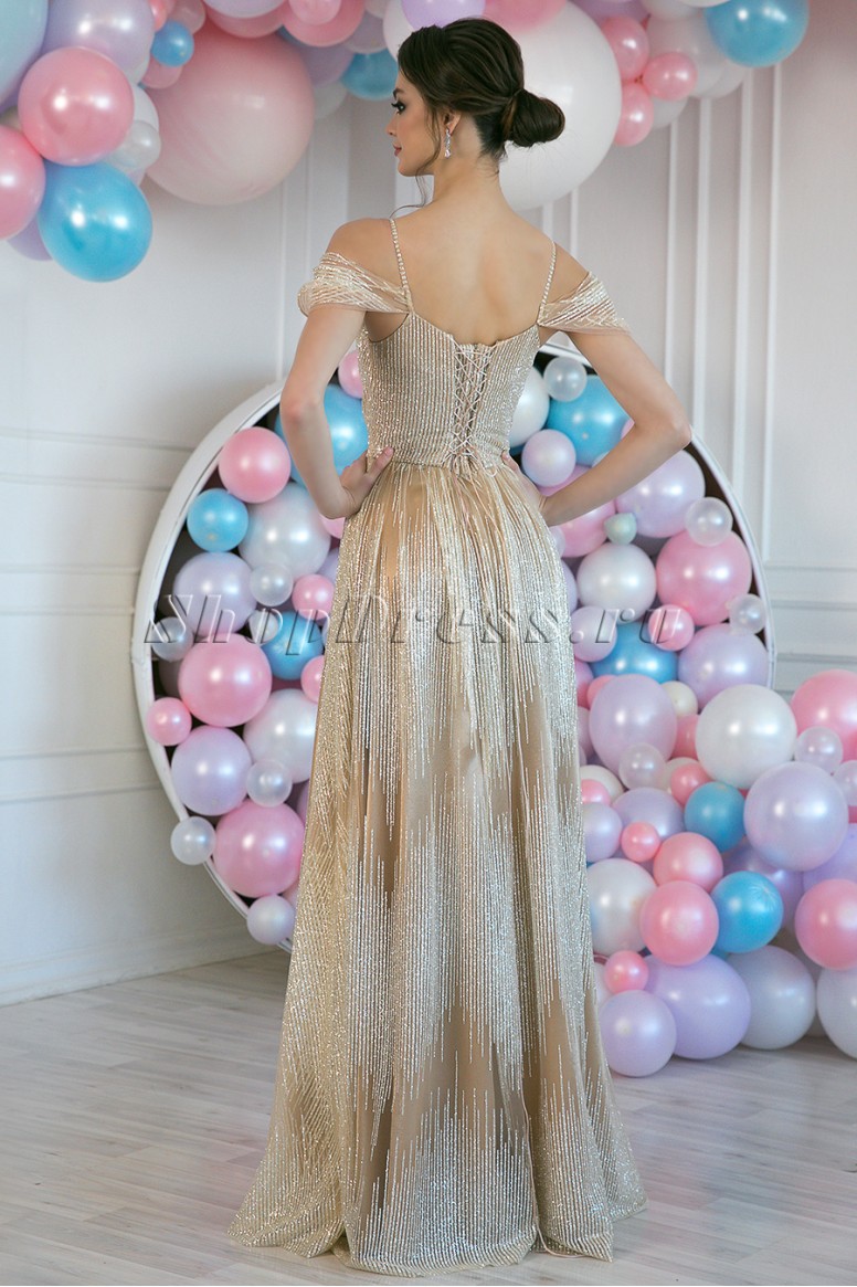 Вечернее длинное блестящее платье Евгения выглядит поистине по-королевски! Роскошное декольте, мягкие спадающие складки из сетки с глиттером по плечам! Разбегающиеся веером складочки на лифе, собранная в мягкую сборку сетка на юбке - и все это мерцает серебристыми волнами на золотом атласе! Корсетный лиф замечательно подчеркивает фигуру, придает благородную осанку! Свадьба, выпускной бал, светский раут - это платье предназначено именно для таких значительных торжеств.