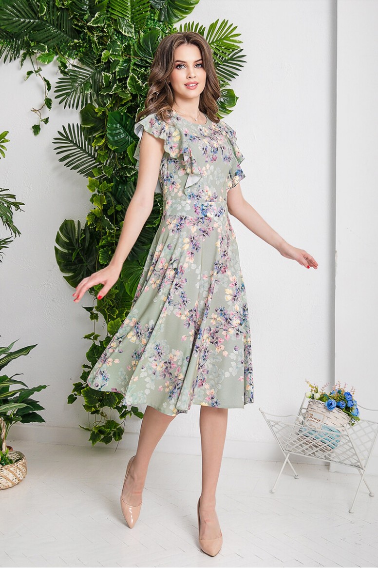 Летнее струящееся платье, которое не оставит никого равнодушным. Отрезное по талии. В нем хочется быть романтичной кокеткой. У платья летящая юбка длинны миди. Рукав флаттер переходящий на грудь будет выгодно подчёркивать её.