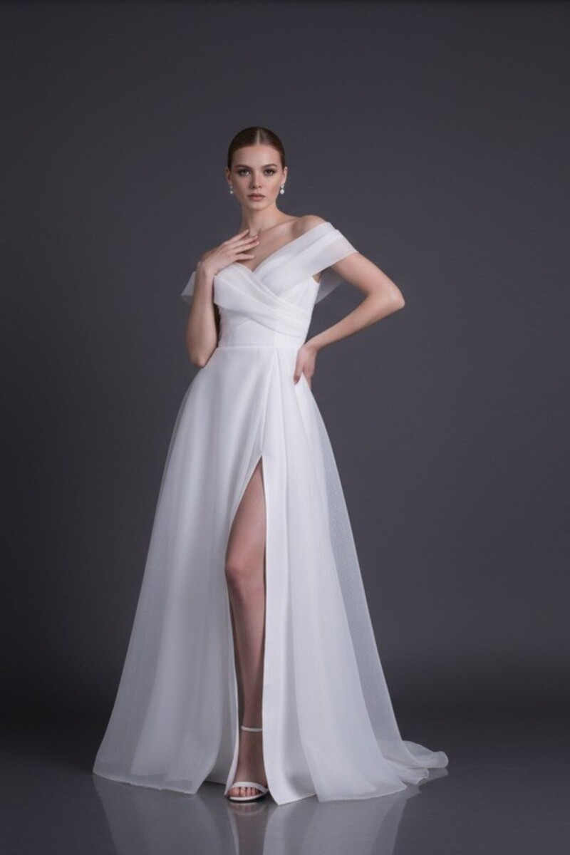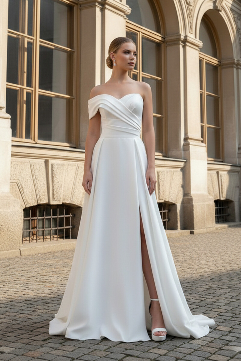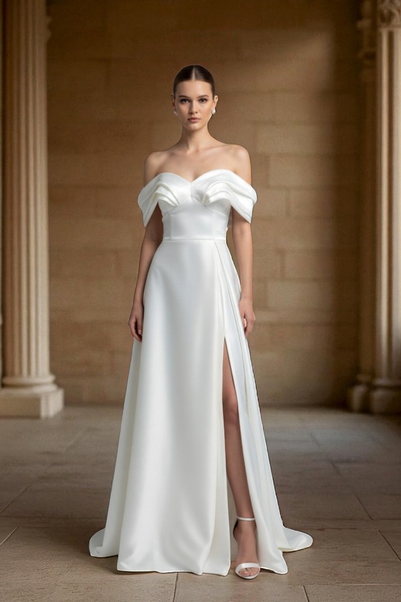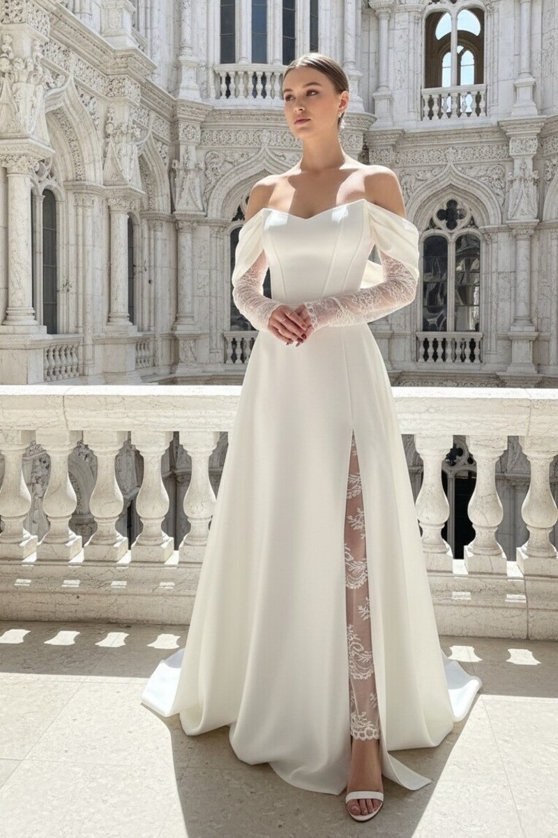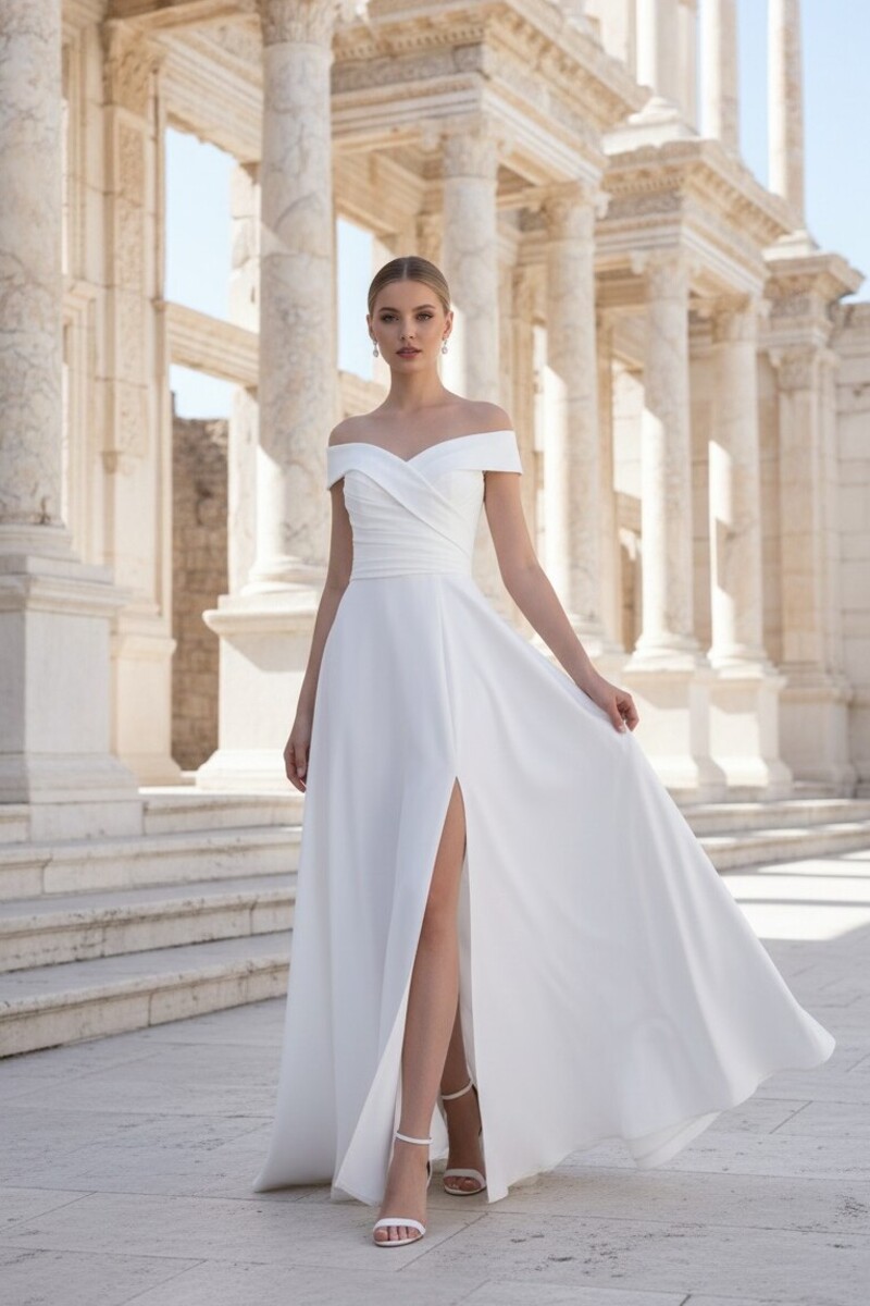 - Летняя свадьба: легкие ткани, открытые плечи и короткие рукава.