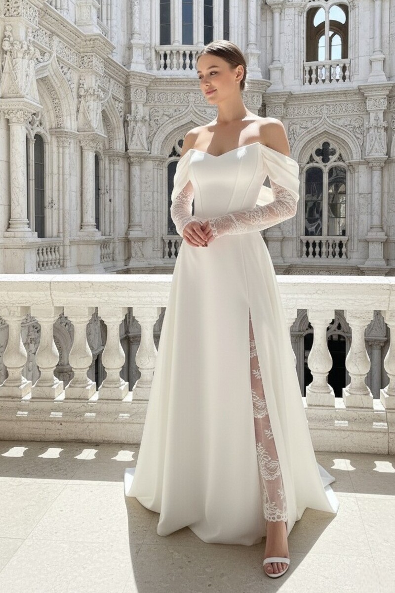 Хотя классический белый остаётся вне времени, в 2026 году всё чаще встречаются нежные оттенки: айвори, слоновая кость, молочный, пудровый розовый и даже лёгкий лавандовый оттенок. Особенно популярны омбре-переходы и двухцветные модели, где разрез подчёркивает контраст.