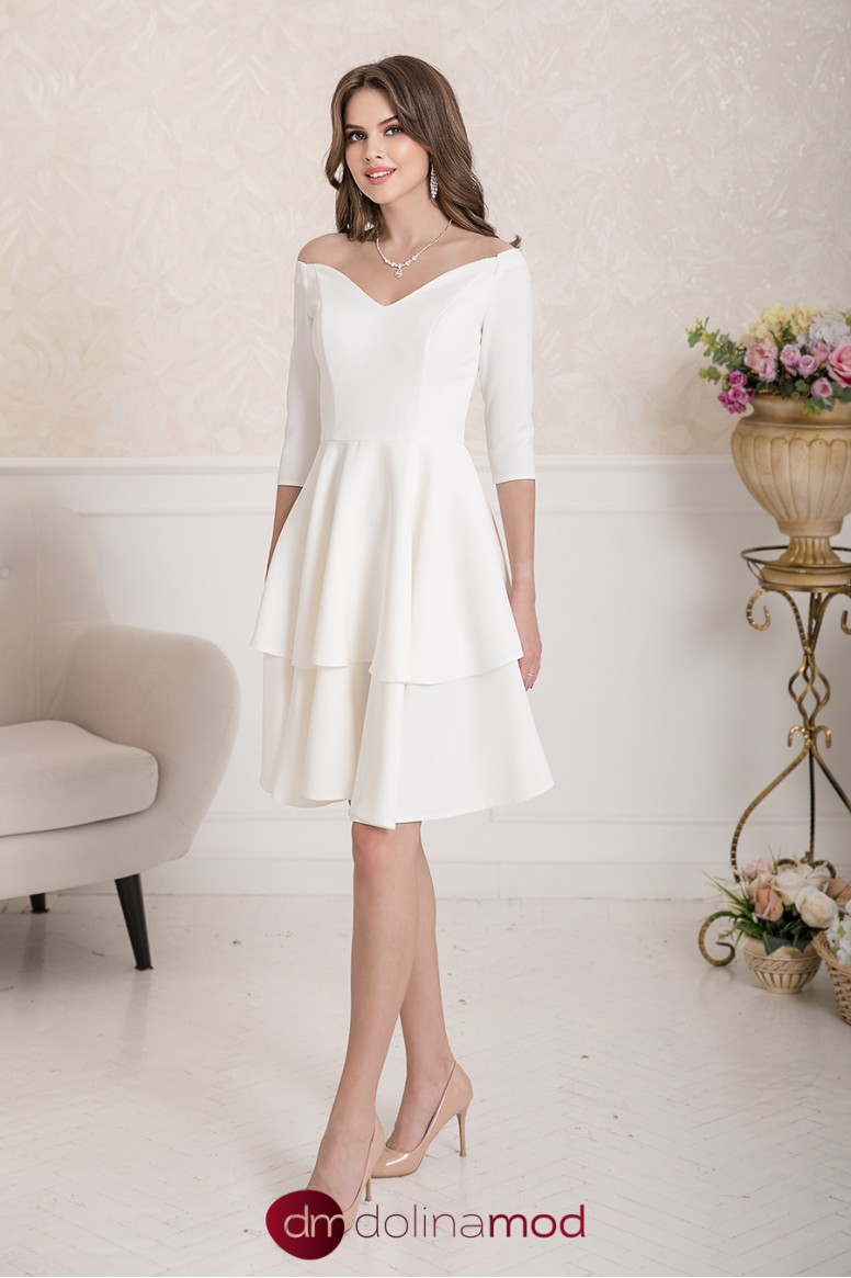 Короткое свадебное платье Софи как нельзя лучше подойдет для небольшой свадьбы. Недорогой, комфортный наряд, но за счет красивого фигурного декольте, оставляющего открытыми шею и плечи, идеально сидящего лифа, и игривой юбочки, состоящей из двух ярусов, невеста будет просто неотразима!