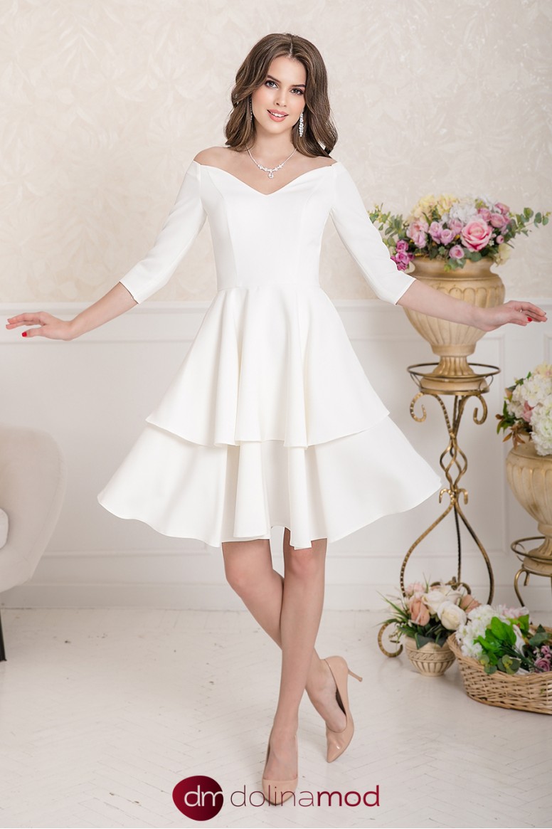 A short wedding dress with a full skirt is perfect for a cheerful young bride who does not..