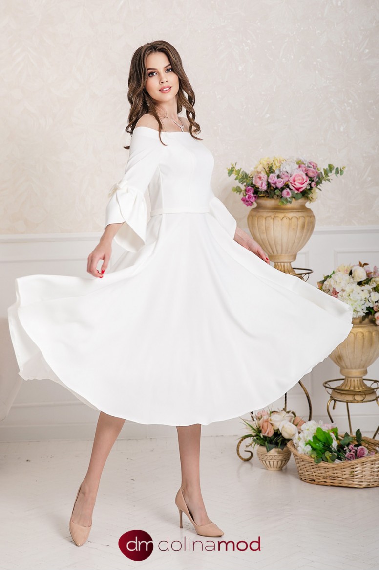 платье с открытыми пелчами, платье длинны миди, платье с рукавами